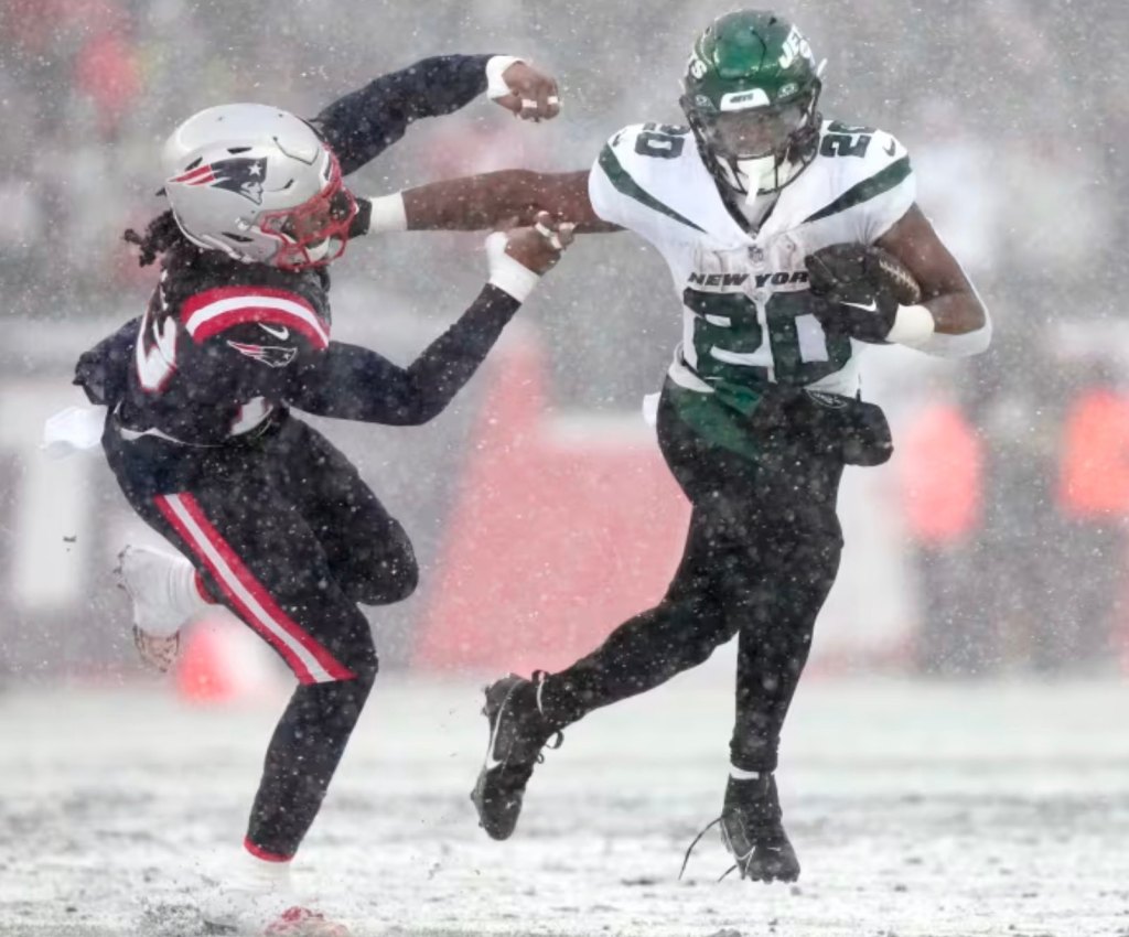 Both the Jets’ 15-game losing streak to the Patriots and their dismal 2023 season came to an end Sunday afternoon in a 17-3 win over New England in game played through heavy snow.