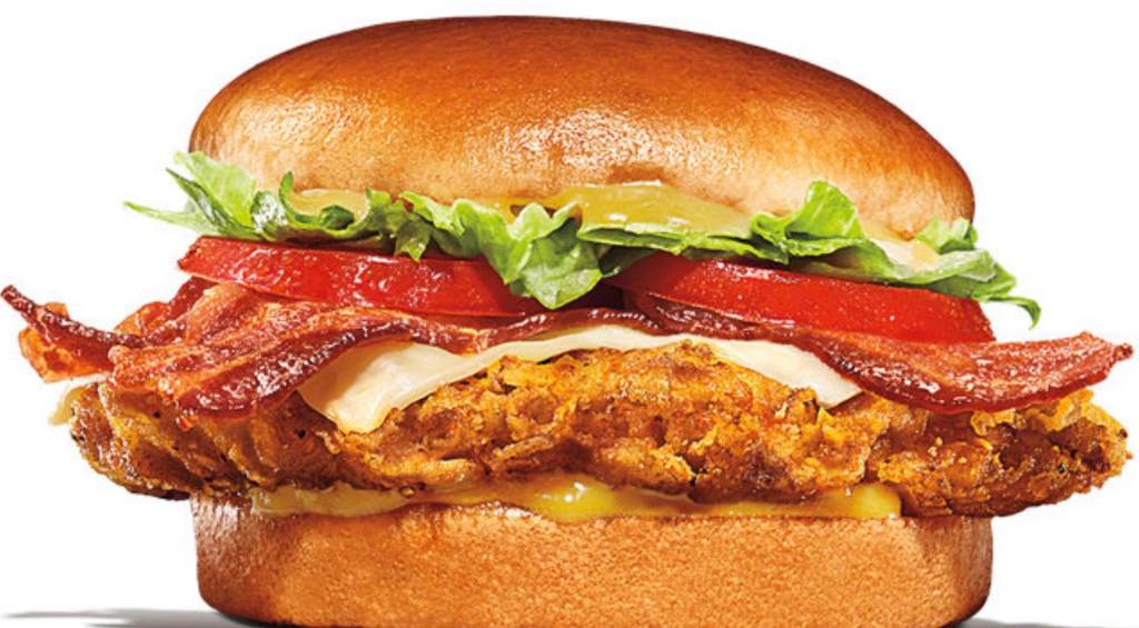 The Honey Mustard BK Royal Crispy Chicken Sandwich features a crispy white meat breast fillet topped with honey mustard, creamy Swiss cheese, crispy bacon, lettuce and juicy tomatoes on a toasted potato bun.
